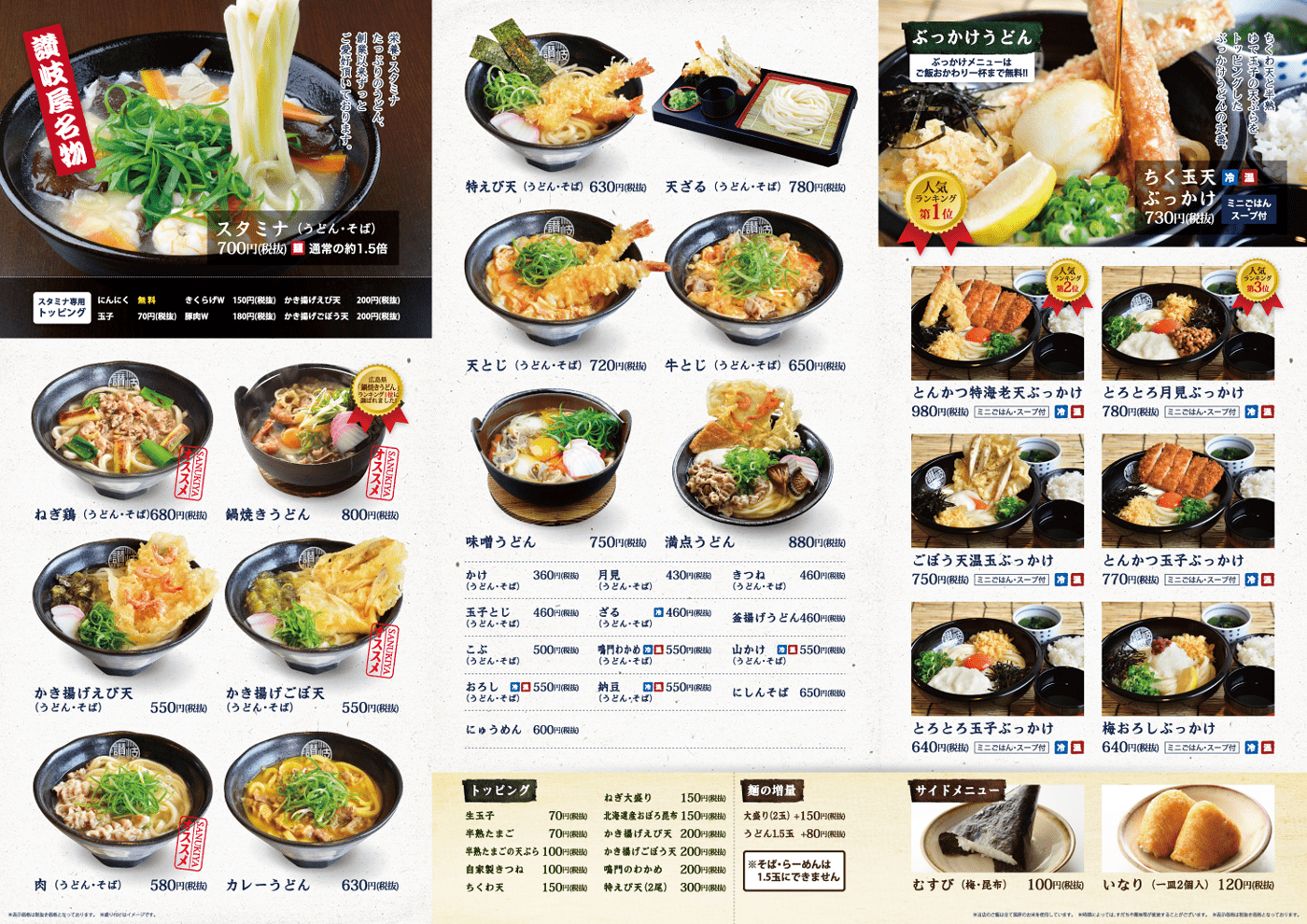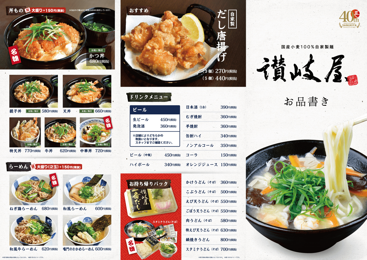 1977年創業した広島のうどん店である讃岐屋。創業者から受け継いだ讃岐屋の味を守るべく、だしは代表自ら毎日とったものを各店で提供。厳選した食材のみを贅沢に使用し、スタッフが一から手作りで丁寧に調理している讃岐うどん店です。WEBサイトや各種ポップ、サイン関係なども制作しておりますが、グランドメニューも弊社にて制作させていただきました。