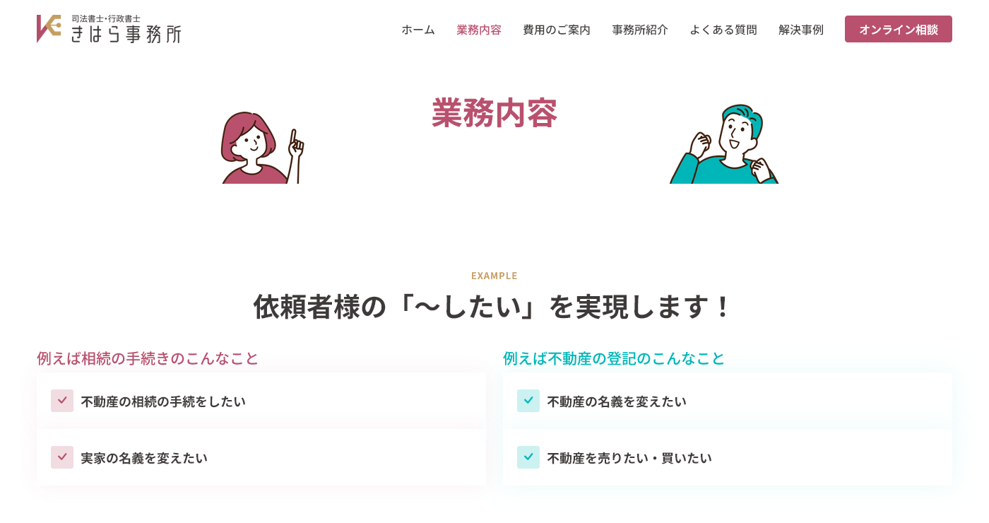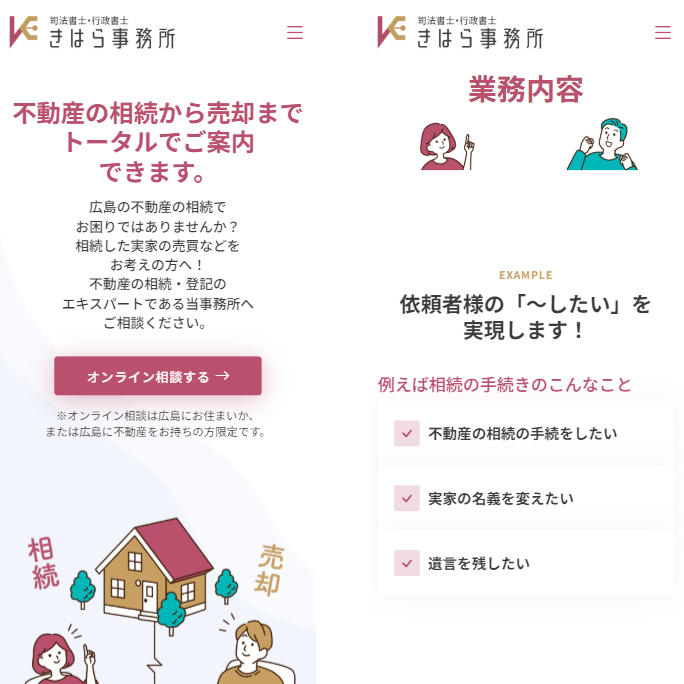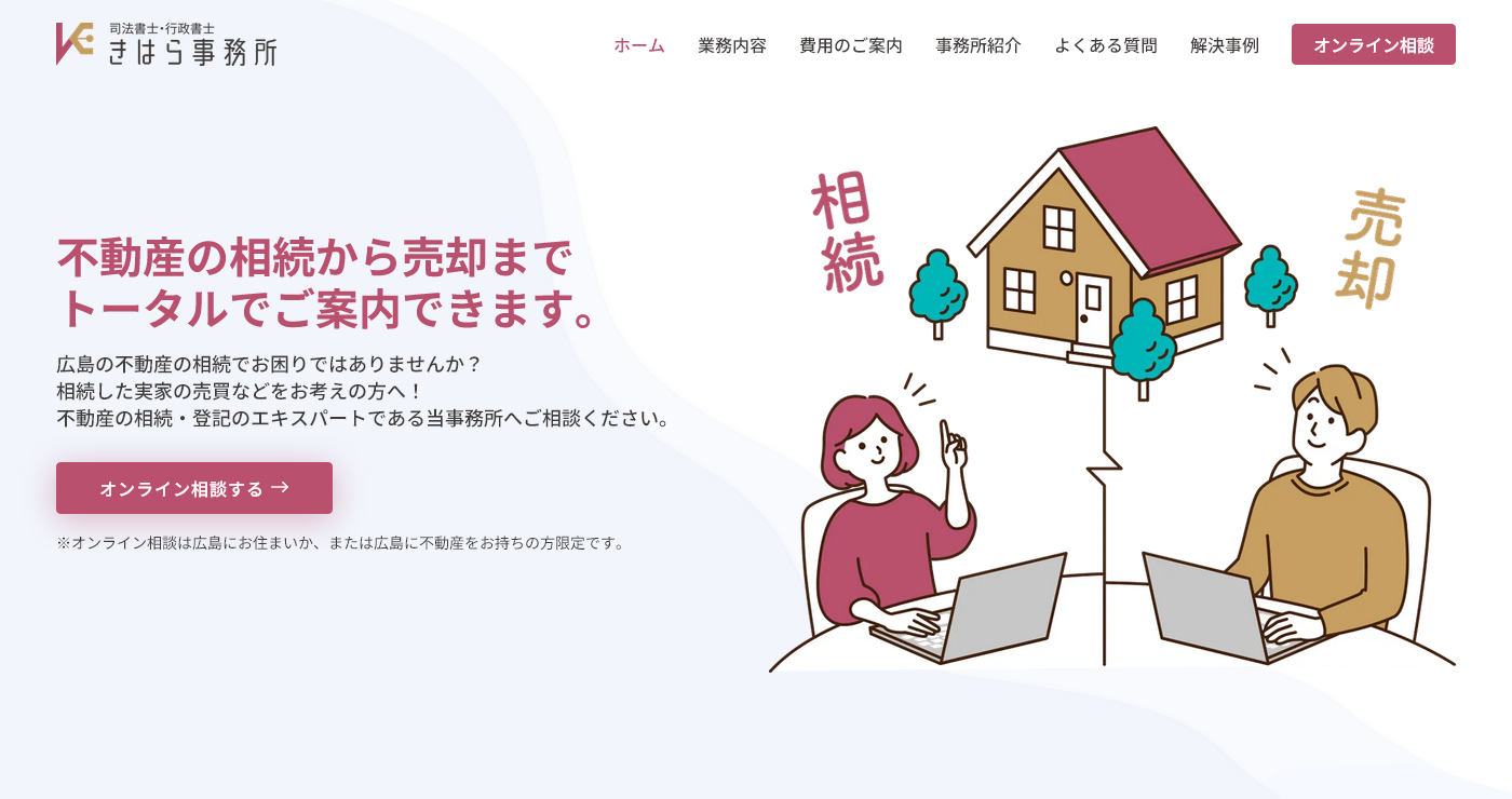広島の不動産相続に関する登記から売却まで、トータルでサポートするきはら司法書士・行政書士事務所様のWEBサイトを制作させて頂きました。広島在住者、または広島に不動産を所有している方を対象に、オンライン相談サービスを提供されています。