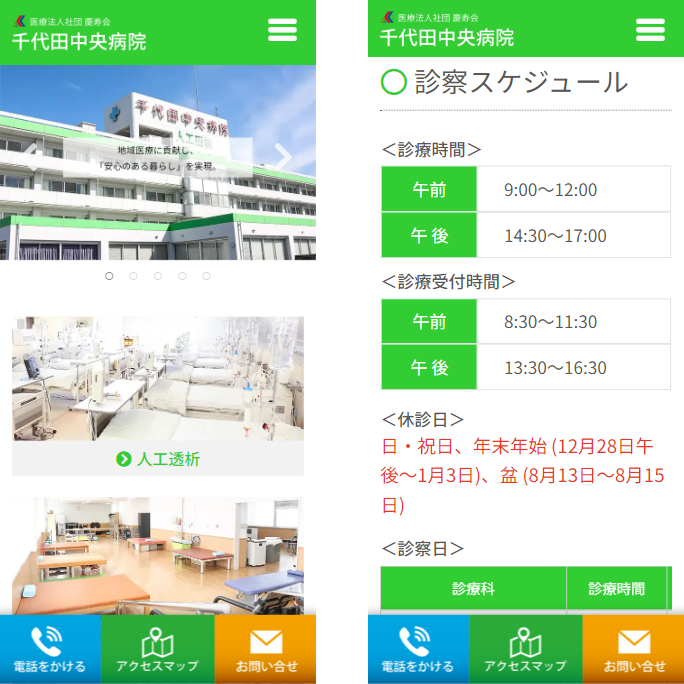 内科・外科はもちろん整形外科や眼科など幅広い診療科がある千代田中央病院様のWEBサイトを制作させて頂きました。モバイル用の画面では電話やお問い合わせ、マップがすぐに確認できるようなレイアウトにさせて頂きました。「安心のある暮らし」の実現を掲げ、地域に根ざした医療を提供されています。