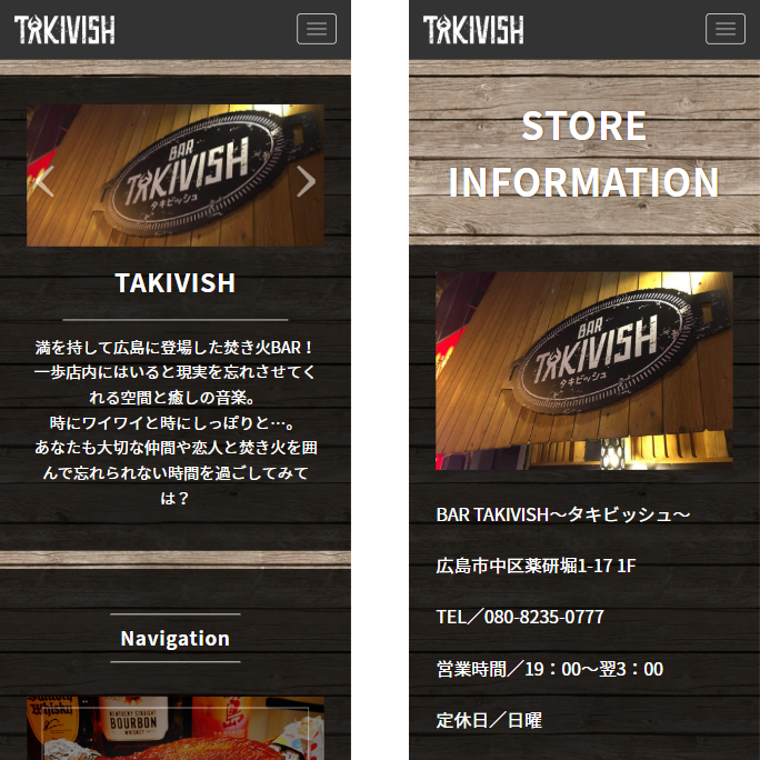 広島では珍しい屋内で焚火をしながらお酒やおつまみを食べれるBAR形態のTAKIVISH様のWEBサイトを制作させて頂きました。 一歩店内にはいると現実を忘れさせてくれる空間と癒しの音楽。 時にワイワイと時にしっぽりと…。あなたも大切な仲間や恋人と焚き火を囲んで忘れられない時間を過ごしてみてはいかがでしょうか。